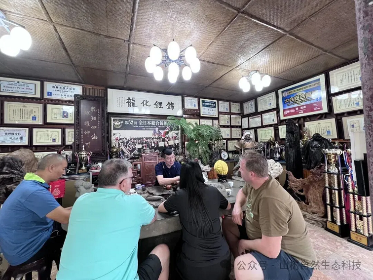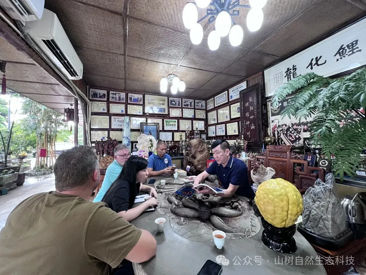 在山树团队的陪同下,拉尔夫先生与安德鲁先生参观了潘生的长龙鱼场。